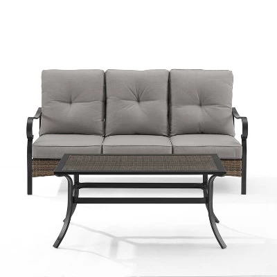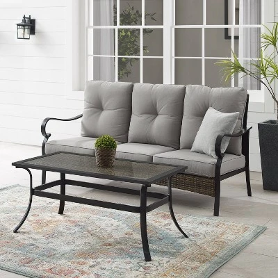 The Dahlia 2pc Sofa Set charms with traditional elements like curved arms and x-back seating. Constructed of powder-coated steel, the sofa offers deep cushioned seats covered in spun polyester, while the coffee table is topped with resin wicker covered in tempered glass. To complete the look, the sofa has a wicker accent along the base which complements the coffee table, making the Dahlia sofa set a unique addition to your patio or deck.