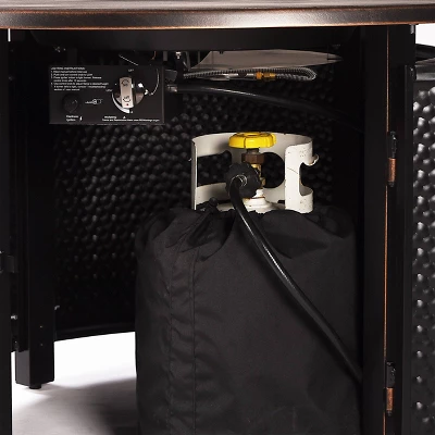 Whether your outdoor retreat is located in the mountains, on the coast, or somewhere in between, this fire table set will extend your evenings with friends and family around the fire. With this addition you can enhance your outdoor setting with even more ambiance and relaxation. This fire table set comes with an Outdoor Aluminum 44 in. Round Fire Table Set with Four Deep Seating Swivel Rocking Chairs, Fire Beads, Lid, Propane Tank Cover and Table Fabric Cover. The dimensions for the fire table are: 44″ L x 44″ W x 24.5″ H, 71.5 lbs. Each chair dimensions are: 28.3″ L x 33.8″ W x 34.2″ H, 29 lbs. The chair seat is 12.6″ H from the seat to the floor.