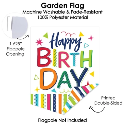 Cheerful Happy Birthday Garden Flag INCLUDES 1 polyester fabric material garden flag in a vertical pennant shape that measures 12 inches wide and 15.25 inches tall. (Flagpole Not Included) Cute Decor: Welcome houseguests with this weather resistant Happy Birthday Garden Flag. Printed double-sided, Cheerful Happy Birthday – Colorful Birthday Party Decor Garden Flag looks great placed close to your home, added to flowerpots, or displayed next to your favorite garden gnome decoration. Yard & Home: Cheerful Happy Birthday Garden Flag is machine washable and fade-resistant, allowing you to easily display in your outdoor lawn or inside your home for a fun Colorful Birthday Party decoration. The small and cute size helps make this a great housewarming gift for a loved one’s deck, patio, porch, or yard. High-Quality Supply: Cheerful Happy Birthday Garden Flag is professionally printed double-sided on 100% polyester material. With a 1.625-inch flagpole opening, easily & quickly display the vibrant Happy Birthday Garden Flag. Please Note: Flagpole Not Included – will fit most standard-sized garden flag stand flagpoles. Printed In The USA: Cheerful Happy Birthday outdoor lawn and home Garden Flag is designed and manufactured at our Wisconsin facility using materials that are Printed in the USA – Fabric Flag Made in China. Cheerful Happy Birthday Garden Flag uses a No-Mess Glitter Print: Our Garden Flag is designed with a printed image of glitter, eliminating glitter flake while maximizing bling effect!