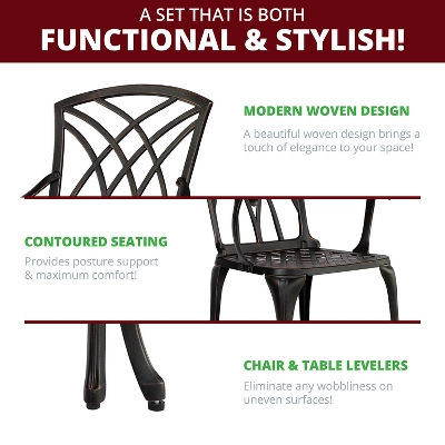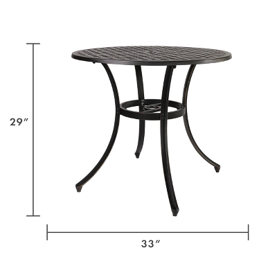 Indulge in an elegant outdoor dining experience with the Kinger Home Lily 33–inch Round Outdoor Dining Table. Crafted with a strong cast aluminum frame, this modern lattice weave-designed patio dining table is both stylish and durable. The compact round table provides ample dining space and includes a 2″ umbrella hole. Pre-installed adjustable foot levelers were included for stability.