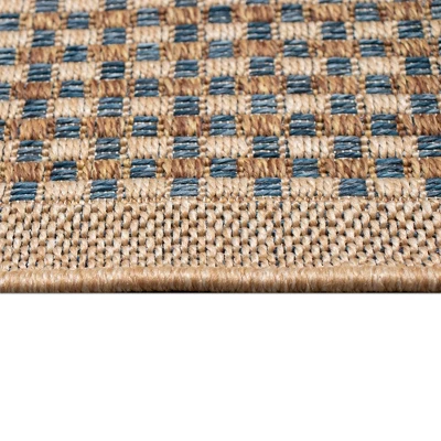 This machine-made performance area rug features a traditional textured weave in a tweed pattern with a natural border that adds visual interest in blue and neutral hues. Made in Turkey from 91% Polypropylene/9% Polyester, the Monterey Collection is Power Loomed to create subtle, organic patterns created by a dense weave with a high-quality finish. The material is flatwoven, fade resistant, durable, easy care, low profile, UV stabilized and ideal for those high traffic areas such as your patio, deck, kitchen and living room making this the perfect indoor or outdoor rug. Durable and stylish patterns create a relaxed easy vibe that is universal and works with any decor in your home. Limiting exposure to rain, moisture and direct sun will prolong rug life.