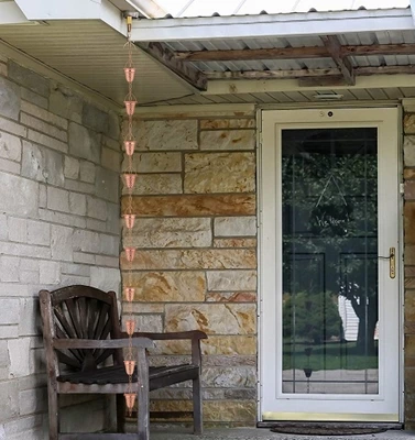 Discover the enchanting alternative to traditional downspouts with Marrgon Copper Rain Chain. Made of 100% uncoated copper, this attractive, maintenance-free rain chain boasts a beautiful shine and rustic patina that only improves with age and exposure. The sustainably produced copper material allows clean, natural harvesting of rainwater, beneficial to the environment and your garden.This decorative rain chain showcases an adjustable link chain designed with charming bell-shaped cups, optimally spaced for maximum water diversion. Watch as water cascades from the gutter in a mesmerizing waterfall display, directing it away from your house and towards a watering can, rain barrel, or basin.Installation is effortless with the built-in V hook that sits securely in the gutter hole. The flexible system allows for link removal and cup placement adjustments. Moreover, it can accommodate 2-story usage through connected chains. To ensure stability, extra links stake to the ground to prevent swaying.Drawing inspiration from centuries-old Japanese design, Marrgon Copper Rain Chain offers more than a functional, eco-friendly water feature. As rain falls, you’ll be treated to a soothing chime sound and an instant elegance added to any gutter system. Experience the delightful combination of design, function, and sustainability with Marrgon Copper Rain Chain.