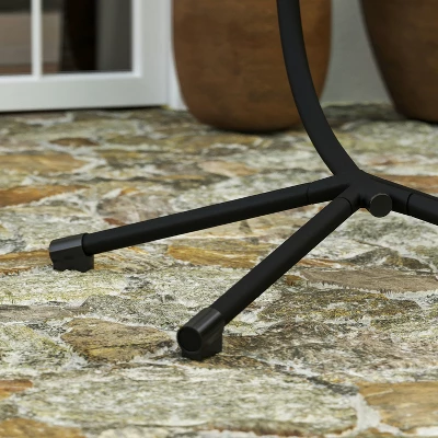 Create an upscale lounge area indoors or outdoors with this all-weather C-stand ideal for your favorite hanging chairs from egg chairs to kids sensory swings. Durably constructed from powder coated galvanized steel and boasting a wide, X-shaped base, this hanging chair stand supports up to 300 lbs. static weight and allows 360° rotation for easy conversation. Assembly takes less than 30 minutes and cleanup is easy with a damp cloth so you can relax sooner, rather than later.