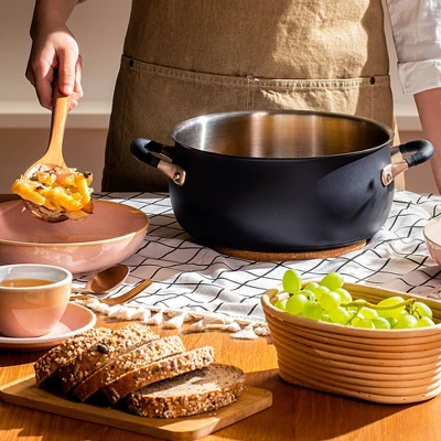 A good Dutch oven is your meal ticket to hearty one-pot meals: think pasta bakes, braised beef bourguignon, vegetarian chili, and more. Prep your recipes on any cooktop (including induction), finish them in the oven, and serve them hot and bubbling to gasps of delight. Oven safe to 445°F, this go-anywhere, do-anything casserole making, slow braising pot features a ceramic hybrid nonstick exterior finish for an easy cleaning, sleek and modern look, and is always dishwasher safe for the most adaptable, high-performance, beautiful Dutch oven meal maker we could dream up.