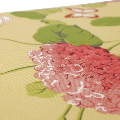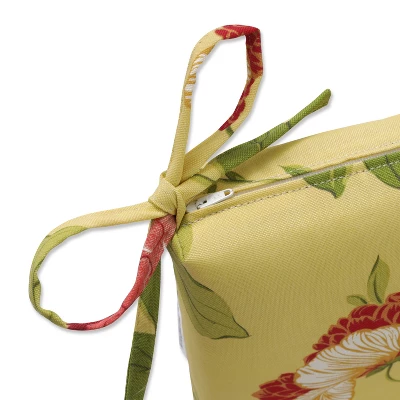 Dotted with butterflies and lovely flowers, this outdoor bench cushion delivers a look of tranquility. In shades of red, off-white and green, its botanical pattern is set on a background in a soft shade of yellow. Polyester fabric is weather- and fade-resistant. Additional features of this outdoor bench cushion include square corners, 14″ ties and recycled polyester fill with a zippered closure for easy removal. Also suitable for indoor use.