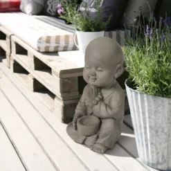 LuxenHome Gray Resin Meditating Buddha On Column Outdoor Fountain With LED Light