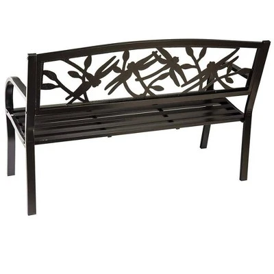 Our Dragonfly Metal Garden Bench is a classic favorite for any outdoor spot. Perfect for two, it’s ideal for enjoying the shade of a tree, placed among the flowers or as prime seating on your patio. Sturdy, full-sized bench features a decorative back with dragonflies in-flight and perched on leafy branches. The classic black finish looks good anywhere. Our Dragonfly Metal Garden Bench has a sturdy steel frame with cast iron back design panel. All-weather powder coat. Easy assembly.