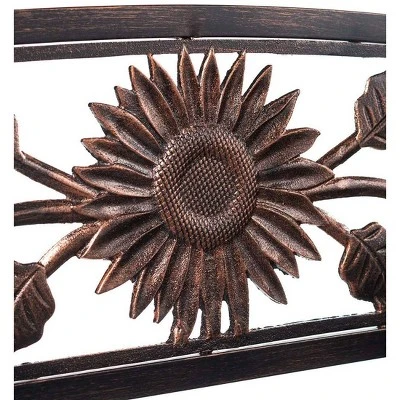 This cheerful Sunflower Metal Garden Bench checks all the boxes: the detailed sunflower design makes the bench a work of art as well as high-quality outdoor seating. This bench is a great value for outdoor furniture. Generously sized and perfect for two, it’s the perfect spot to relax and enjoy your garden, a nice view or a good book. This decorative garden furniture features a beautifully detailed back with sunflowers, stems and leaves. The classic design lends a timeless look to any setting. A must-have for your home and garden! Sturdy steel frame is painted black; cast iron back design features a brushed copper finish. A slatted seat and rounded arms add to the timeless appeal. All-weather powder coat. Easy assembly.