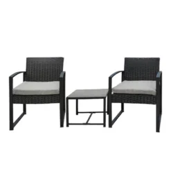 3pc Wicker Patio Conversation Set With Cushions – Black/Gray – GODEER