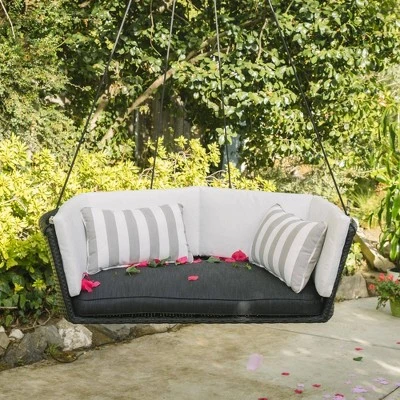 The resin wicker loveseat swing has comfortable thick olefin cushions and striped pillows. The swing also includes heavy duty rope and 2 carabiners, making it easy to start hanging with friends. With a 52” width and 500 lbs weight capacity, the loveseat swing is built for 2. The durable swing will last for years in your favorite R&R spot – inviting you to take a break every time you cross its path.
