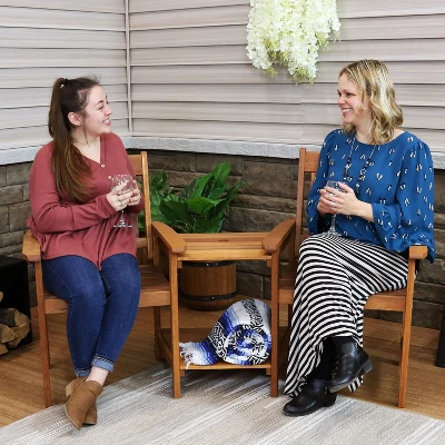 Enjoy great conversation and cool drinks outside on the balcony or in the backyard with this Meranti wood jack-and-jill outdoor furniture set. Constructed of meranti wood with a beautiful teak oil finish, this outdoor furniture set takes the guesswork out of coordinating furniture as it is two chairs and one table all in one piece. This set stands strong and durable against outdoor elements. The table features a handy shelf that is perfect for storing towels for the poolside or soft blankets when it gets chilly. Everything needed to assemble this unique piece of furniture is in the box, including the components, hardware, and tools. This all-in-one furniture set is perfect for small spaces, like apartment balconies, or to supplement other pieces of outdoor furniture on the patio or in the backyard. Sit comfortably with friends and family members while enjoying a cup of tea, beautiful sights, and fresh air.