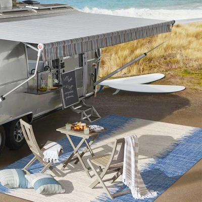 Our modern rug’s denim blue border is woven with a strie effect to create a central stripe design. This versatile rug’s minimalist look is perfect for a coastal cottage porch or modern outdoor patio. The simple design is a family-friendly solution for a Scandinavian style living room, modern bedroom, kitchen hallway, entry or kids bedroom. The pet-friendly and kid-proof flatweave design makes it easy to clean, and perfect for the beach house.