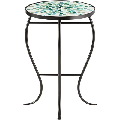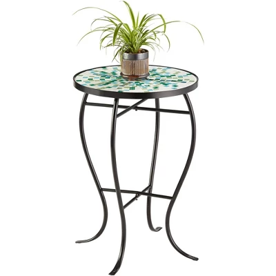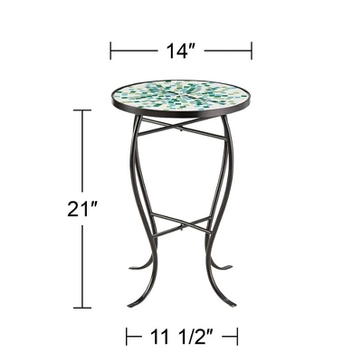 These round outdoor accent tables set of two feature a sophisticated inlaid tile mosaic top made from aqua blue and green pieces. The frame and curvaceous legs are constructed of black finish iron that will withstand the elements. From the Teal Island Designs brand, these tables are a great way to add fresh style and function to a porch or deck.